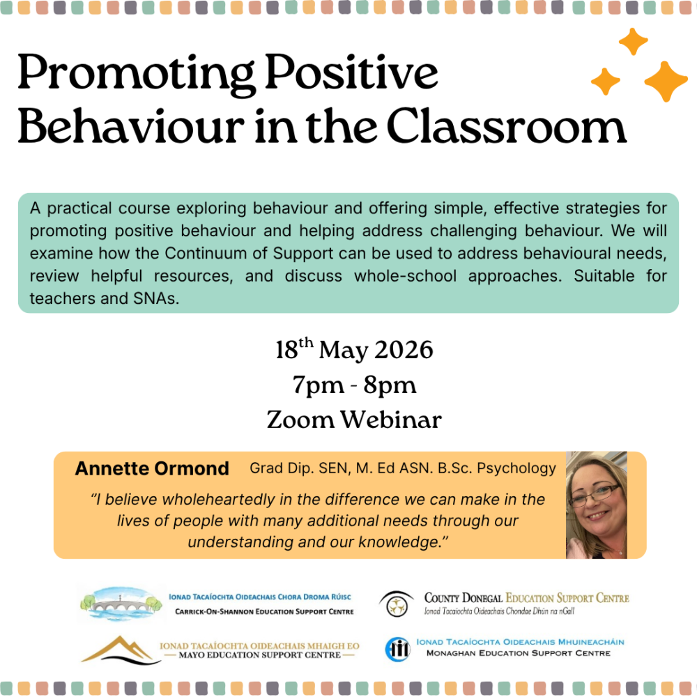 A practical course exploring behaviour and offering simple, effective strategies for promoting positive behaviour and helping address challenging behaviour. We will examine how the Continuum of Support can be used to address behavioural needs, review helpful resources, and discuss whole-school approaches. Suitable for teachers and SNAs.