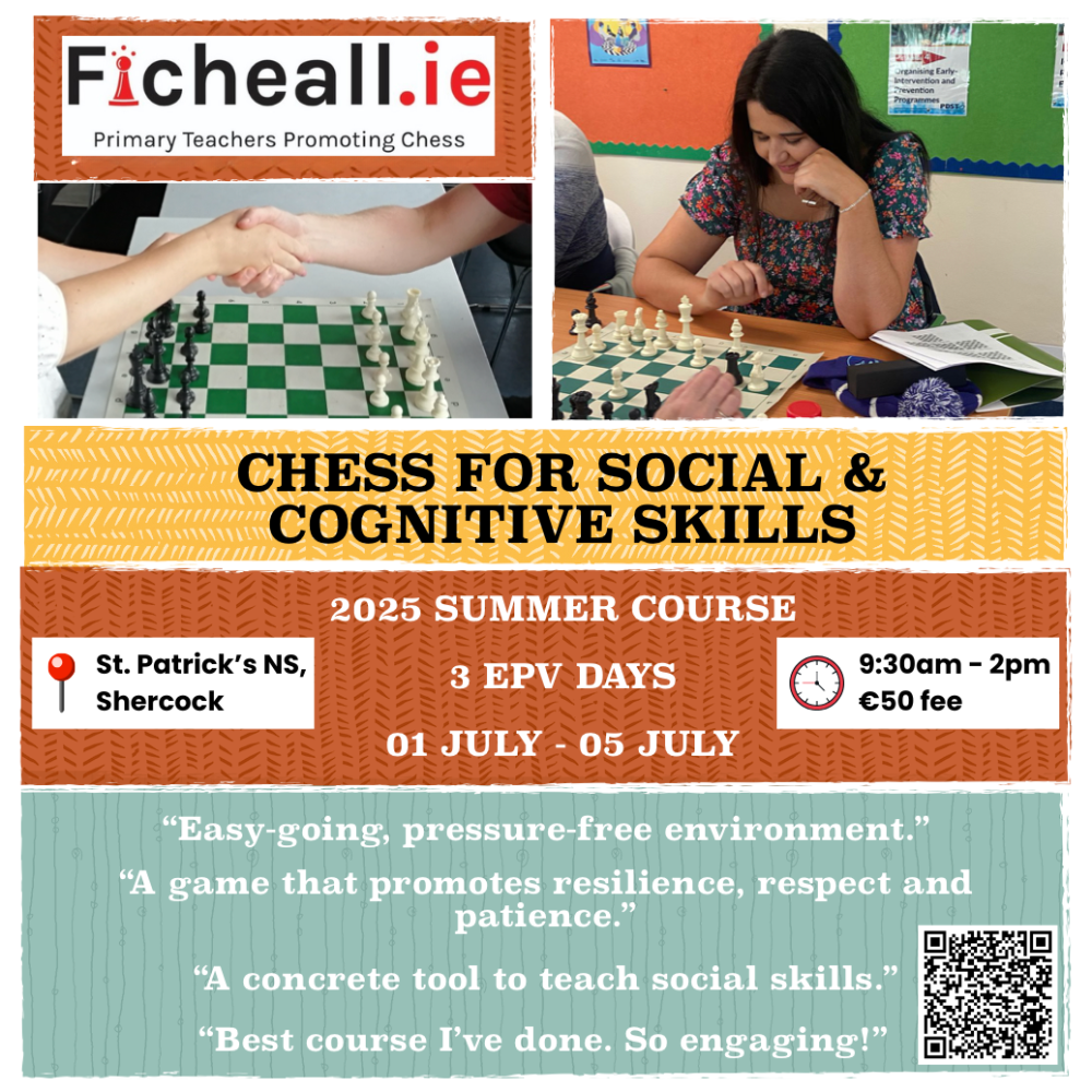 Chess for Social & Cognitive Skills is like no other summer course as it is extremely hands-on and teacher-centred. Chess is a growing pastime in Irish primary schools with the 350 schools now joined the Ficheall network of teachers promoting chess in primary schools. It is an excellent hobby for students (and teachers) for rainy days and promotes a variety of social and cognitive skills such as respect, forward planning, problem solving, decision making, accepting defeat, understanding resilience and developing a productive disposition to problem solving; all of which are addressed in the free beginner lessons available to participants. Course is approved for 3 EPV Days.